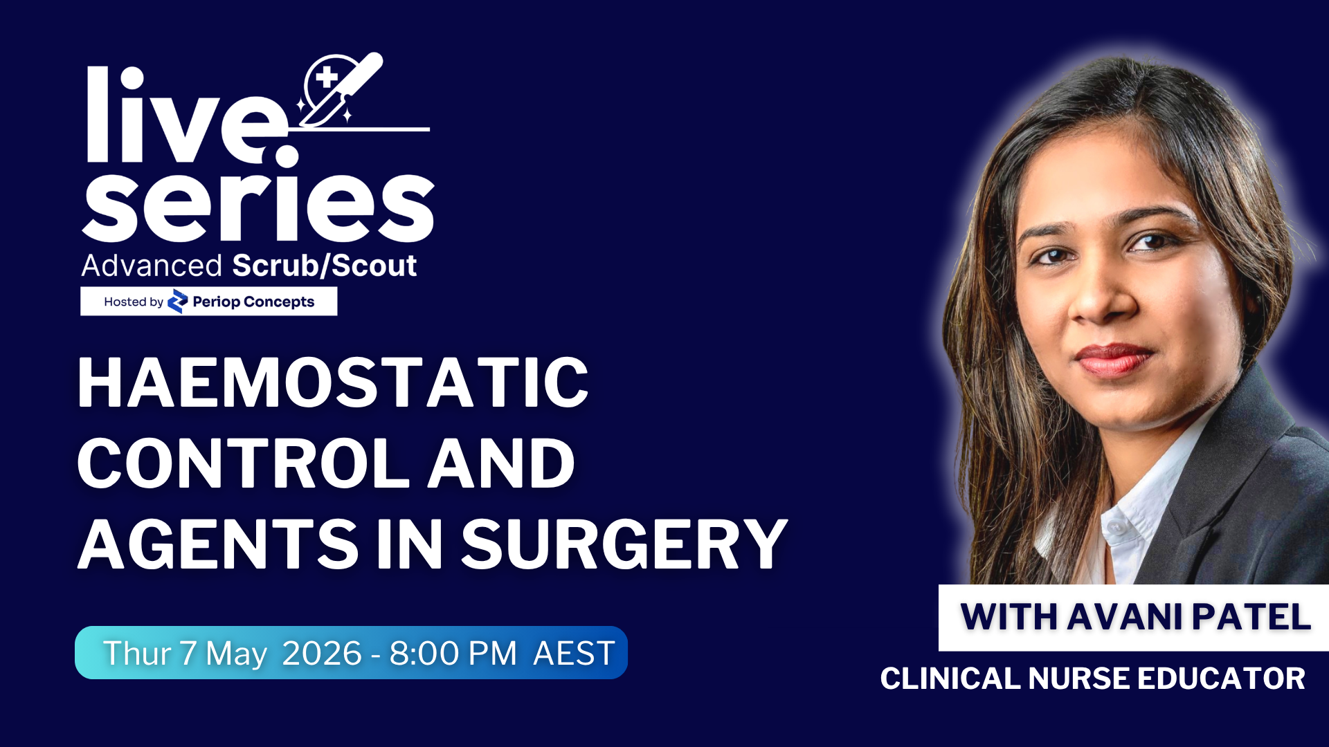 Join Periop Concept Creator Avani Patel for a practical Scrub Scout session on haemostatic control and agents in surgery. This session covers common intraoperative bleeding scenarios, when and how haemostatic agents are used, and practical strategies to support safe, effective surgical care in the operating theatre.